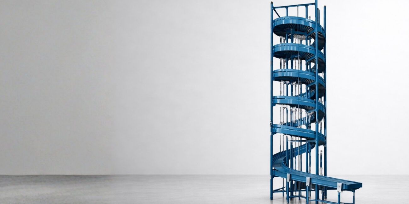 A space-efficient gravity-driven solution designed to smoothly and safely move products between multiple floor levels using a continuous spiral path, reducing handling time, labor effort, and energy costs while improving workflow efficiency.